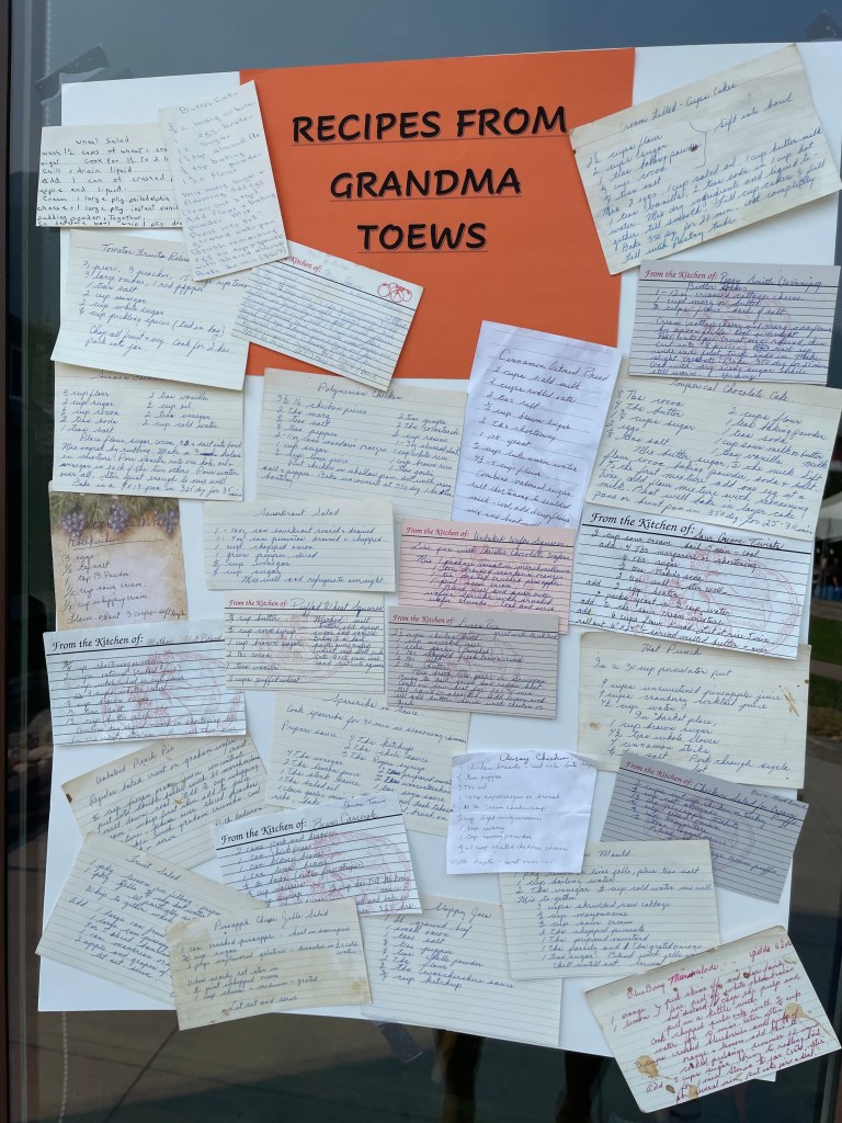 A creative practical tribute to Mom Toews (now deceased), displayed a tidbit of favourites from her kitchen when serving the wide circle of family, and their friends, around her table.