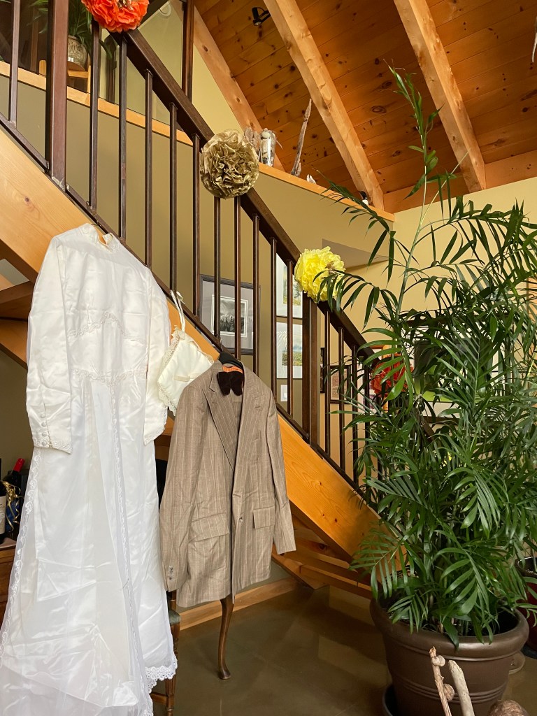 Our wedding attire: after fifty years lying in the cedar chest is appropriately wrinkled!