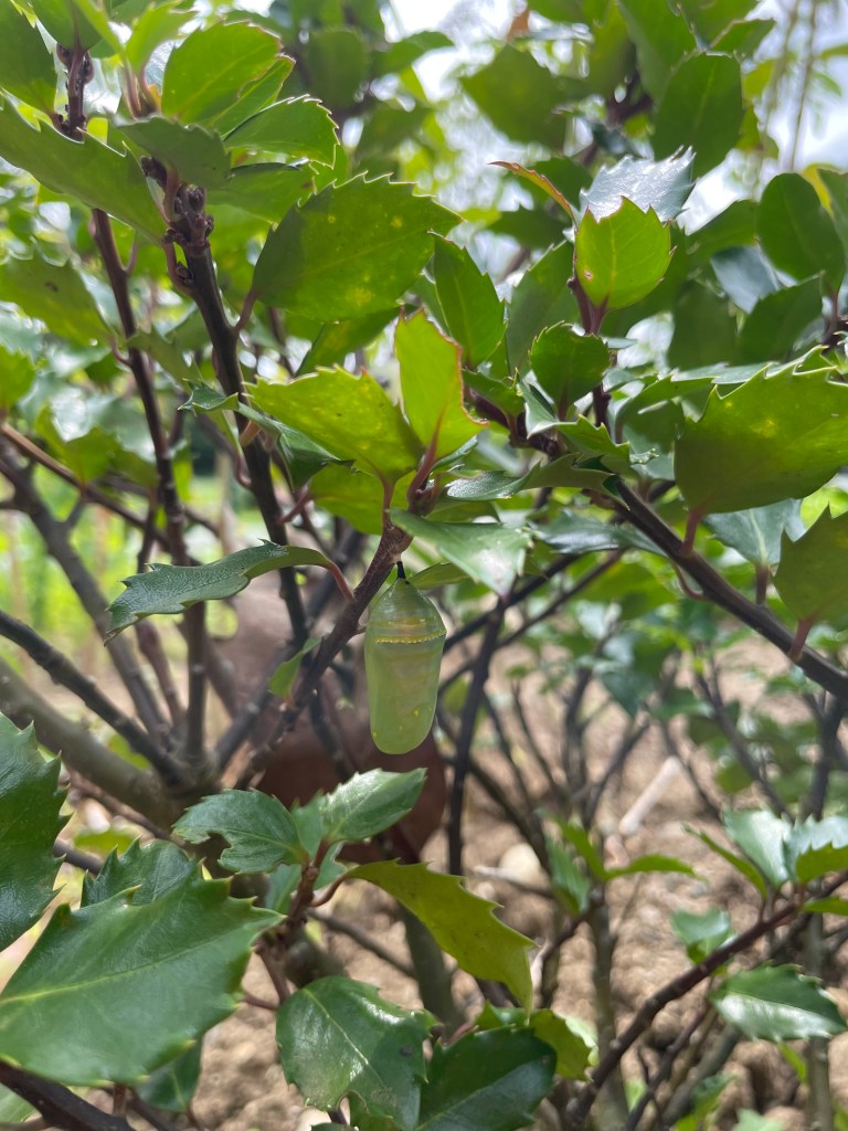 Shared appreciation for Monarch butterflies: their flitting about, watching caterpillars feeding on the milkweed, the excitement discovering the chrysalis below, tucked in the holly plant.