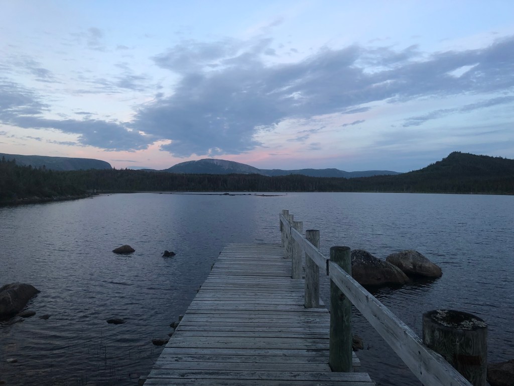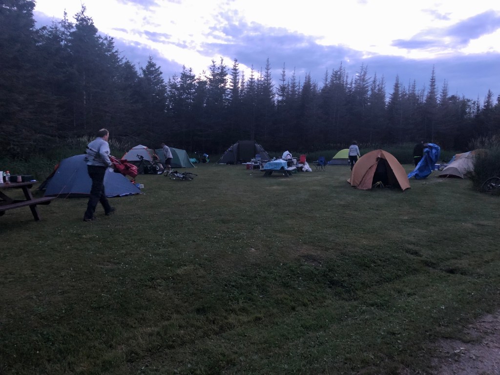Happy to finish (survive) this first ride on ‘the rock ‘ our group set up camp at Gros Morne Berry Hill campground . With a cook house/shelter (and plug-ins to charge our phones), showers and bathrooms, a fire pit surrounded with circular-seating, we were set to pitch our ‘tent city’, make and eat supper – and for some: a short walk around Gull Pond. A perfect spot to end a tiring day.