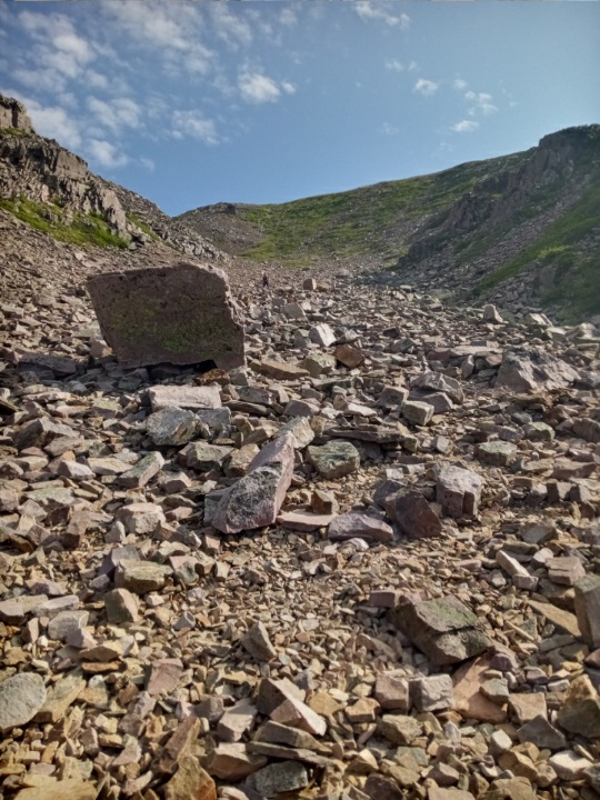 This arduous, spectacular hike boasts a not particularly well-marked trail, with tortuous black flies and the possibility of snow. The first two conditions were confirmed first-hand the day before, descending the summit of Gros Morne, where we’d had a ‘shouting conversation across the valley’ with a hiker finishing the Long Traverse trail. The flies were ‘driving him mad’; after which we were privy to the yelling conversation between him and his female partner who’d lost the trail, equally frustrated by the bugs, and “could he come find her or at least wait up for her!” He evidently kept charging ahead to get beyond the miserable insects; we saw him “across the valley” shortly after: they were still communicating so nobody was in danger.