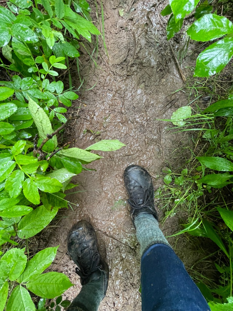 Overcast, the day looked soggier than what we’d hoped for. Regardless, we decided to ‘just check out’ the trailhead; another 10km from Pleasant Bay. I drove here a couple years ago and knew it’s a packed dirt-gravel road (or after a significant rainfall would be a muddy drive) with many large protruding rocks. Thankfully we met only a couple other vehicles, and after carefully pivoting around MANY water holes with no indication of their depth, we reached the trail parking lot. Google gives it this address: 1773 Red River Road. There was no way Brad and I were repeating this drive again. We parked the car, pulled on our raincoats and hiking shoes – neither which offered much protection from goopy mud and rain-laden bushes – grabbed our poles and set off.