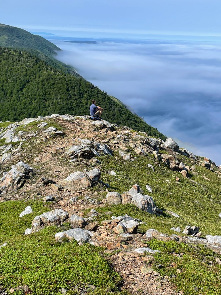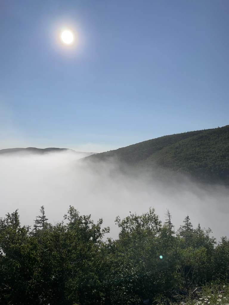 A gentleman at the motel recommended Blueberry Mountain: the trail isn’t listed in the park’s brochure but can be accessed across the highway from the Cap Rouge parking lot. We were so glad we didn’t miss this. A magical drive to the parking lot – trailhead – in sunshine above the clouds hanging over the ocean, which scattered into puffy strands once we started and summited Blueberry Mountain.